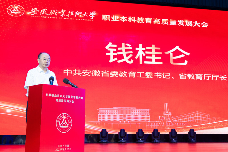 本网讯(办公室)8月16日上午9时,安徽职业技术大学职业本科教育高质量发展大会在至立会堂成功召开。安徽省委教育工委书记、省教育厅厅长钱桂仑,安徽省委教育工委委员、省教育厅副厅长刘业勋,兄弟院校领导、合作企业代表以及学校党政班子成员、部分退休校领导、校友代表、师生代表近千人,共同见证学校跨越发展的历史性时刻。