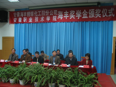 11月21日,我院隆重举行首届“海丰”奖学金颁奖仪式。院长陈传海、安徽海丰精细化工股份有限公司总经理钱俊等领导为获奖师生颁奖。副院长马纯宣读获奖师生名单。院、企有关部门负责人,化工系部分教师及学生代表参加了颁奖仪式。化工系负责人主持颁奖仪式。