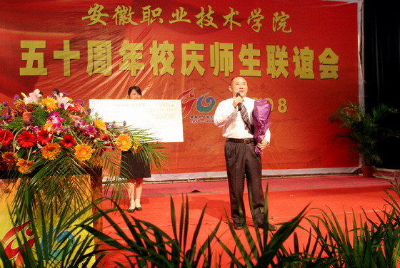 陈传海院长也在大会上致辞,他介绍了学院50年来的艰苦创业历程,指出学院50年孜孜不倦先后为国家培养和输送了5万多名合格的建设人才,他们在不同的领域,不同的岗位做出了惊人的业绩,推动了社会的发展,为经济发展做出了积极的贡献,他们是学院的光荣,是金宝搏188体育在线院人的骄傲;通过几代金宝搏188体育在线院人的不懈努力,学院四校合并后取得了一个又一个的突破,先后获得了多项殊荣,并于2007年被国家教育部确定为百所“国家示范性高职院校建设单位”,学院新校区也正式启用,成为合肥职教基地第一家入住新生的学院。他还指出,学院50年的办学历程,50年的教育创新,50年的辉煌发展,学院的每一次进步,都离不开每一代师生的努力,离不开校友们的关爱和支持,并希望校友能够一如既往地关心学院的发展。最后,陈院长祝福每位校友身体健康,合家欢乐,事业如同母校一样蒸蒸日上。