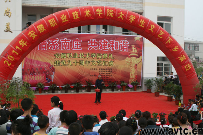 本网讯 (思政教学部通讯员 方希 院记者团记者 程启兰 许苗苗) 4月15日下午,肥西县高刘镇南庄村主任岗希望小学操场上鼓乐喧天,掌声如潮,由188bet足球比赛结果分析和肥西县高刘镇镇党委、镇政府主办,思政教学部、团委和管理系共同承办的 “‘情系南庄 共建和谐’188bet足球比赛结果分析献礼建党九十周年文艺汇演”隆重举行,为当地村民和留守儿童奉上一台精彩纷呈的文化盛宴。