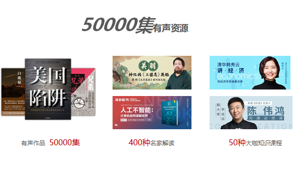 包含5万集有声作品、400余本名家解读书、50种大咖课程;