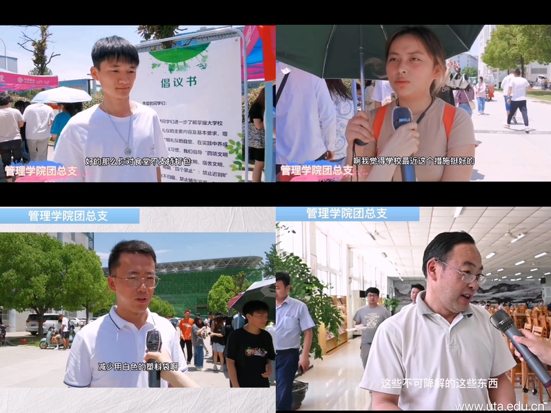 志愿者们随机对食堂文明就餐的师生进行采访,其中会展2021班任义说,在学院禁止食堂塑料袋打包后,就自带饭盒,用餐也更加干净卫生。文秘1922班余千玉说,文明礼仪,作为学生从身边小事做起,小节做起,逐步才能养成自觉的良好习惯。院团委王亮老师谈到,白色塑料袋不容易被分解,在日常生活中,大家可以自行准备易循环使用的编织袋。后勤管理处陶新南处长谈到,每个人努力一点,白色污染减少一点,环境必然越来越好。广大师生表示支持近期学院食堂不支持打包的做法,减少白色污染,创建文明校园。