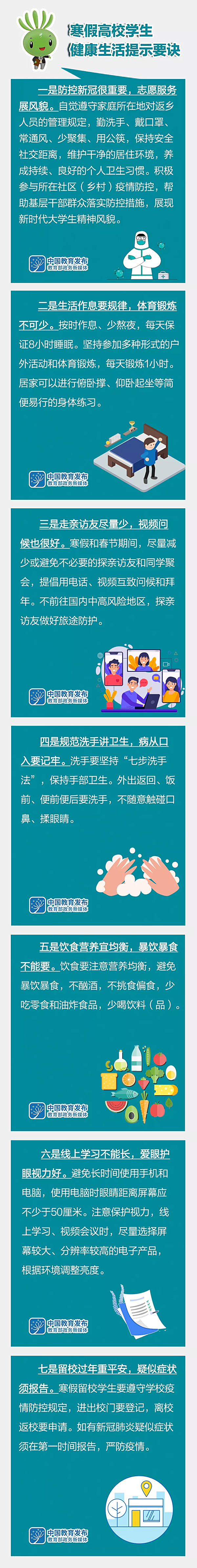 2022年寒假来临,近日,教育部指导全国高校健康教育教学指导委员会专家,提出2022年寒假高校学生健康生活提示要诀,引导高校学生增强“健康第一责任人”意识,合理安排寒假生活和学习,积极参与疫情防控,养成健康生活方式。