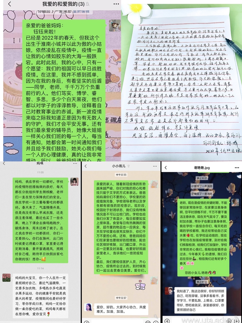 同学们以线上“家书”的形式“云”寄平安,通过书信、短信、视频、图片等形式,给父母们传递一份平安,传递一份思念。同时从学院疫情防控的举措、开展的人身安全教育、日常学习情况、生活饮食等方面,向家长详细介绍了自己在校情况,也提醒家长做好疫情防控,注意身体健康,字里行间透露着温馨。