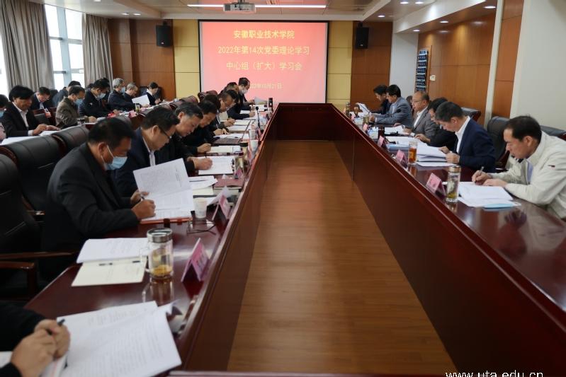 本网讯(党委宣传部通讯员 孙涛)10月21日上午,学院在图文信息中心十楼会议室召开2022年第14次党委理论学习中心组(扩大)学习会。会议集中学习了党的二十大报告,习近平总书记在参加广西代表团讨论时的重要讲话精神以及省委书记郑栅洁在安徽省代表团全体会议讨论党的二十大报告时的讲话精神。党委书记李方泽主持会议,在家院领导,各职能部门主要负责人及各二级学院党总支主要负责人参加会议。
