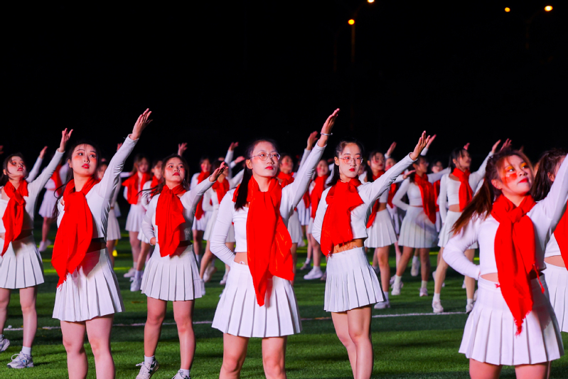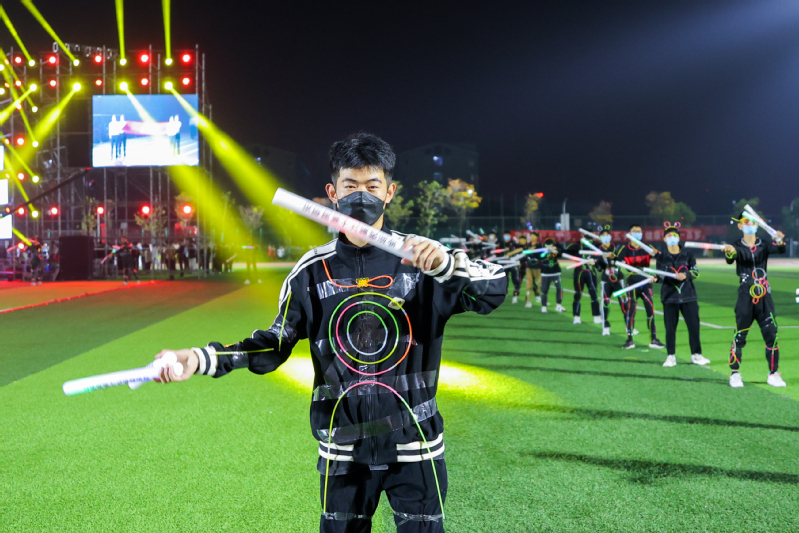 大气质感的舞台线条构造出恢弘的视觉景观,运用超高清LED屏幕显示、直播投影、无人机拍摄等科技手段,助力导演组、演职人员,为全体师生带来了一场文艺和体育融合的视觉盛宴。青春如花,生命因运动而绽放!竞技似火,人生因拼搏而辉煌!由团委大学生艺术团选送的乐队表演《青春之火》正式拉开了文体表演的序幕,动感的音乐、独特的嗓音瞬间点燃了现场的气氛。