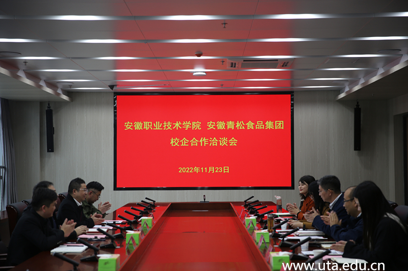 本网讯(环境与生命健康学院通讯员 张晓晴)11月23日下午,合肥高新区人事劳动局人才开发中心主任张力、安徽青松食品集团副总经理陈明山一行来院洽谈校企合作事宜,双方在至公楼第五会议室举行座谈会。院党委委员、副院长杨林国出席会议,环境与生命健康学院党政负责人郝建文、宣凤琴、徐颢溪,食品教研室主任及教师代表参加会议。会议由宣凤琴主持。
