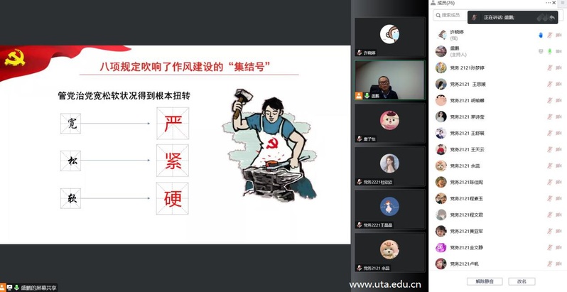 本网讯(马克思主义学院通讯员 许晓婷 高浩翔)为筑牢高校思政课主阵地、用好立德树人主渠道,12月14日晚,院党委副书记、院长盛鹏以线上教学的方式为党务2121、2221班级的学生上了一堂主题为“新时代全面从严治党的伟大实践”的形势与政策课,将从严治党的最新理论送上“云端课堂”。