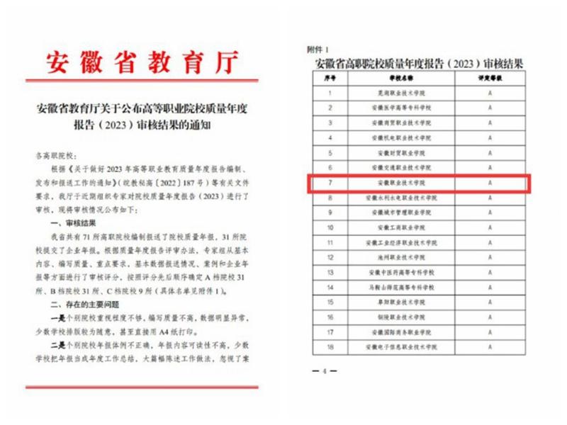 本网讯(教务处通讯员 赵勋)近日,安徽省教育厅印发了《关于公布高等职业院校质量年度报告(2023)审核结果的通知》,188bet足球比赛结果分析报送的质量年度报告获评A等。学院已连续三年获此殊荣,充分彰显了学院近年来丰硕的办学成果和蓬勃向上的发展势态。
