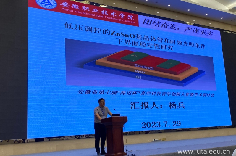 真空科技是集成电路、新材料、新能源、航空航天、大科学装置等国之重器的核心关键技术之一。与会科技工作者围绕真空技术研究前沿和成果转化进行了深入交流,活跃了学术思想,提高了创新意识,实现了真空学术交流和与解决产业技术问题紧密结合,为区域经济发展提供创新动力,以科技服务国家战略需要。作为本次会议学术委员会与组织委员会委员,杨兵老师作了“低压调控的ZnSnO基晶体管和时效光照条件下界面稳定性研究”学术汇报。此次学术研讨会共邀请报告6篇,来自安徽省各高校、科研院所及企业提交口头报告47篇,我校郭巧老师获得优秀论文奖。会后,教师们到安徽微威胶件集团进行了校企产教融合交流。桐城电视台等媒体对本次会议进行了报道。