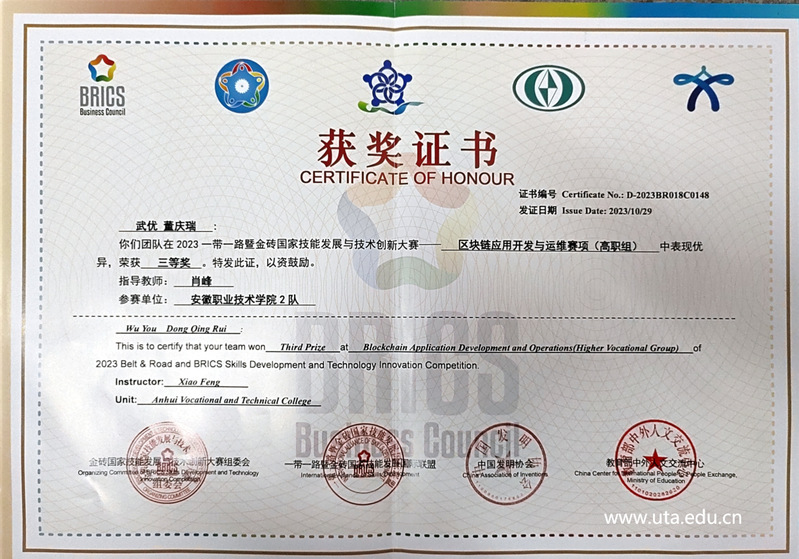 本网讯(计算机与信息技术学院通讯员 周润民 )10月29日,2023一带一路暨金砖国家技能发展与技术创新大赛“区块链应用开发与运维竞赛”在重庆城市职业学院落幕。来自国内外的115支队伍同台竞技,经过激烈角逐,我院派出的两支代表队分别获得二等奖、三等奖,学院获得优秀组织奖。