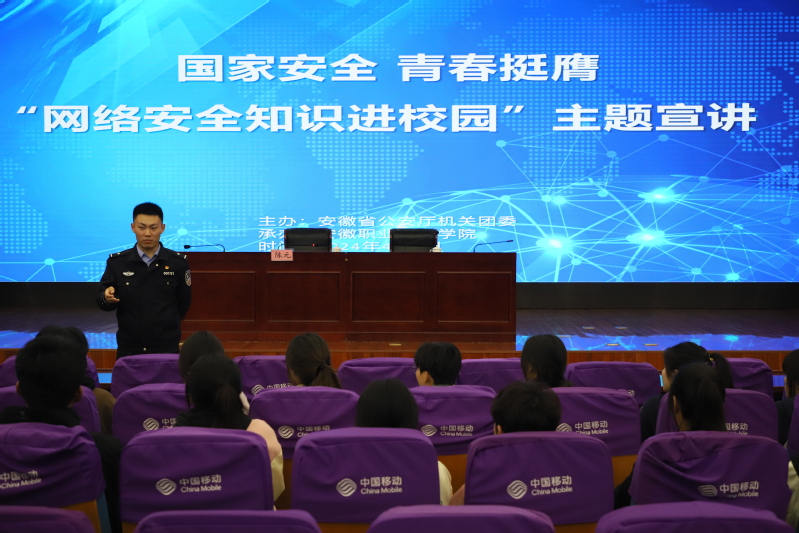 本网讯(团委通讯员 蒯月亭)为全面贯彻总体国家安全观,推动国家安全宣传教育,营造人人讲网络安全的浓厚氛围,4月8日,安徽省公安厅“网络安全知识进校园”主题宣讲活动在我院成功举办。省公安厅副厅长张东明、网络安全保卫处处长李晓留、网络安全保卫处政委张仕东、机关团委书记姚志博等领导莅临活动现场。学院党委书记李方泽,党委委员、副院长宣岩松出席活动。省公安厅机关党委(机关团委)有关同志,厅网安总队有关负责同志、团支部青年民警,合肥市公安局网安支队、新站区网安大队有关负责同志,学院相关职能部门、二级学院负责人,各学院团总支书记、学生代表等共同参加活动。活动由宣岩松主持。