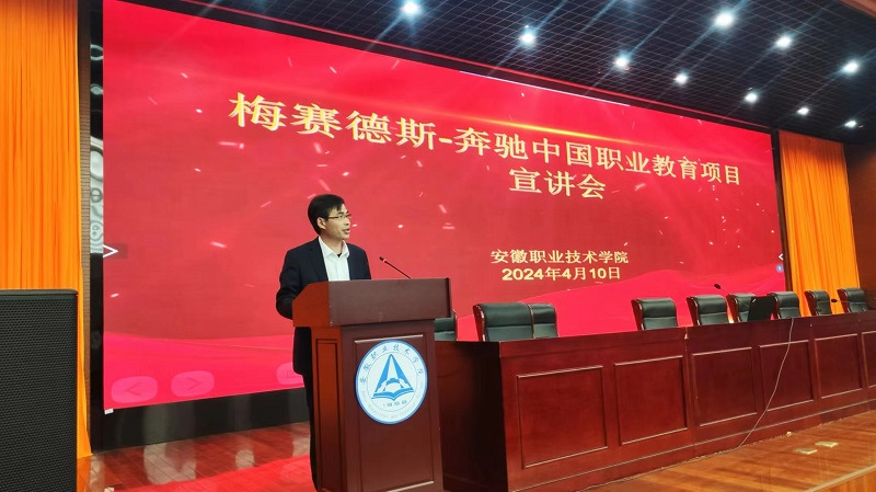 张蜀琪介绍了项目合作模式、教学模式、学生选拔流程、职业教育在线平台等方面情况。她表示梅赛德斯-奔驰中国职业教育项目是梅赛德斯-奔驰(中国)投资有限公司全球职业教育培训体系中的关键组成部分,拥有先进的职业教育理念,为梅赛德斯-奔驰售后服务市场培养高素质的技术技能型人才。该项目由梅赛德斯-奔驰(中国)投资有限公司梅赛德斯-奔驰职业教育项目与国内职业院校合作开办。安徽鹏龙融富奔驰经销店CEC经理朱宝玉就企业文化、员工福利、员工晋级、优秀员工案例等进行了介绍。