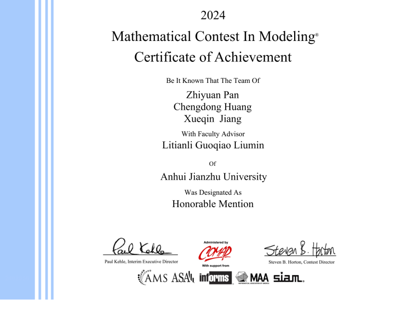 本网讯(计算机与信息技术学院通讯员 曹倩)近日,2024年美国大学生数学建模竞赛(Mathematical Contest in Modeling/ Interdisciplinary Contest in Modeling, MCM/ICM)成绩揭晓。学院与安徽建筑大学联合培养的本科学子潘致远、黄成东、江学琴团队在指导教师李天理、郭巧、刘敏指导下荣获二等奖(Honorable Mention)。