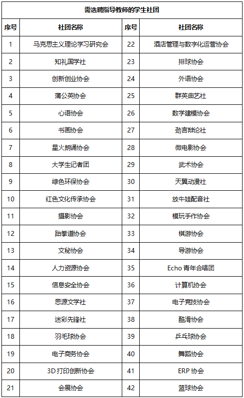 大学生社团作为校园文化建设的重要内容和大学生素质教育的重要阵地,是学院落实立德树人根本任务的重要载体。为进一步提高我院大学生社团专业素质和专业技能,加强指导力量,推动学生社团健康、有序地发展,充分发挥学生社团在繁荣校园文化中的积极作用。根据学院相关文件精神,现面向全院选聘学生社团指导教师。