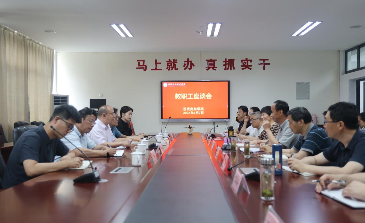 本网讯 6月7日,党委书记李方泽到现代商务学院调研并参加教职工座谈会,相关职能部门负责人陪同调研,现代商务学院党政负责人及教师代表参加座谈会。