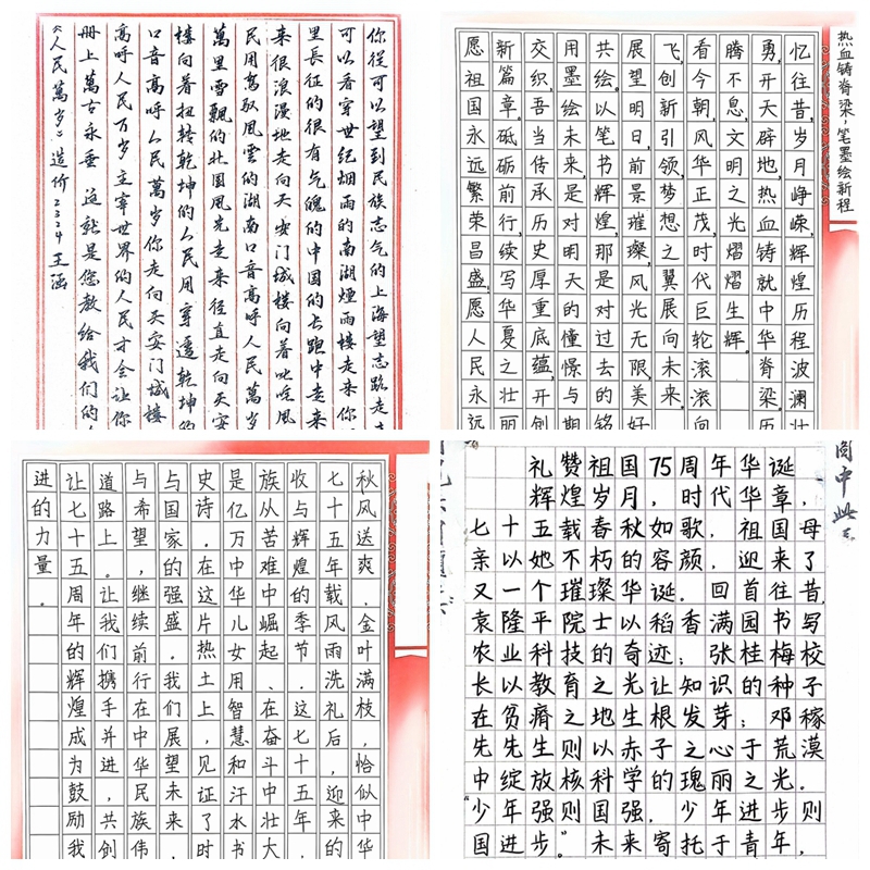 征文比赛同样收到了大量优秀作品。同学们用真挚的语言,讲述了自己与祖国的故事,表达了对祖国的深情厚谊。有的作品回顾了祖国的发展历程,有的作品则展望了祖国的未来,有的作品讲述了学校近几年取得的辉煌成绩,每一篇征文都充满了对祖国、对社会、对学校的热爱和祝福。