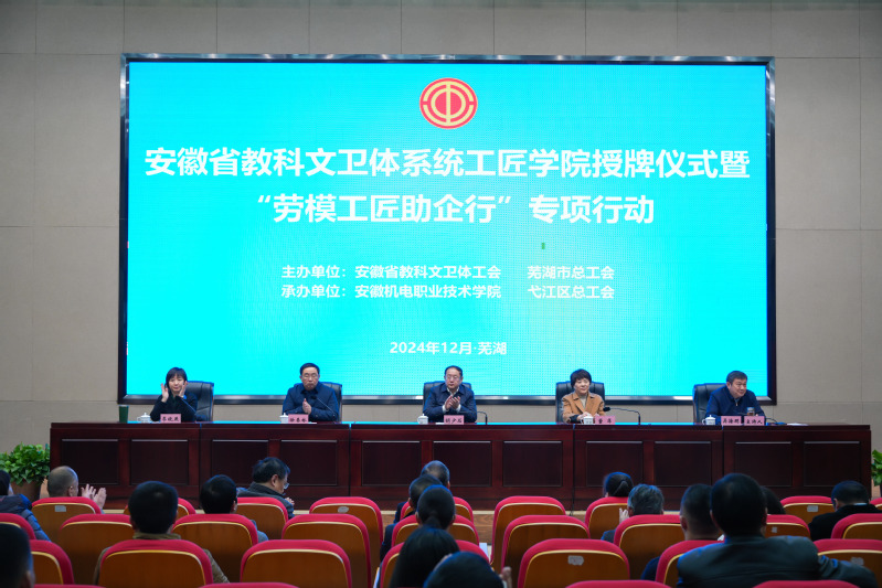 本网讯(工会 继续教育学院)12月11日,安徽省教科文卫体系统工匠学院授牌仪式暨“劳模工匠助企行”在芜湖举行,安徽省总工会党组成员、副主席胡少石,安徽省教科文卫体工会主席吴海明,芜湖市人大常委会副主任、市总工会主席董萍等领导出席会议,学院工会、继续教育学院负责人以及安徽省教科文卫体工会系统单位工会主席及有关企业代表参加会议。