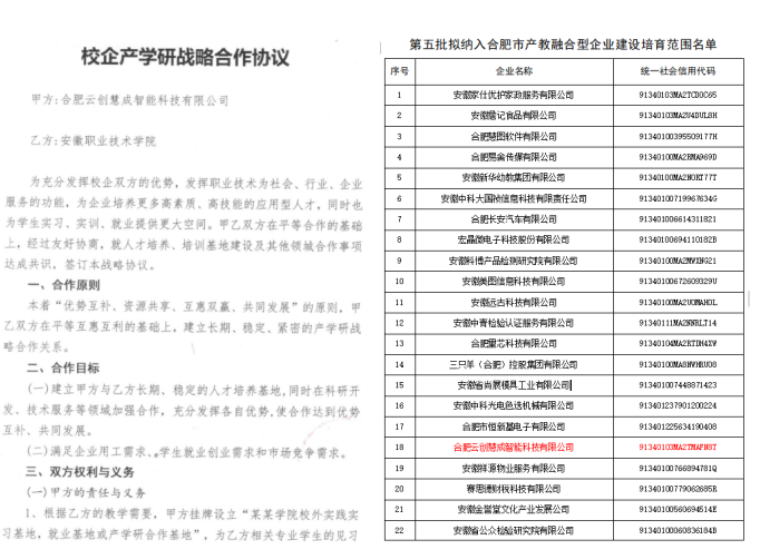 近日,合肥市发展和改革委员会发布《第五批拟纳入合肥市产教融合型企业建设培育范围名单》,全市27家企业入选。能源动力与安全学院校企合作单位合肥云创慧成智能科技有限公司成功入选试点培育企业名单,并纳入合肥市产教融合型企业建设培育库。