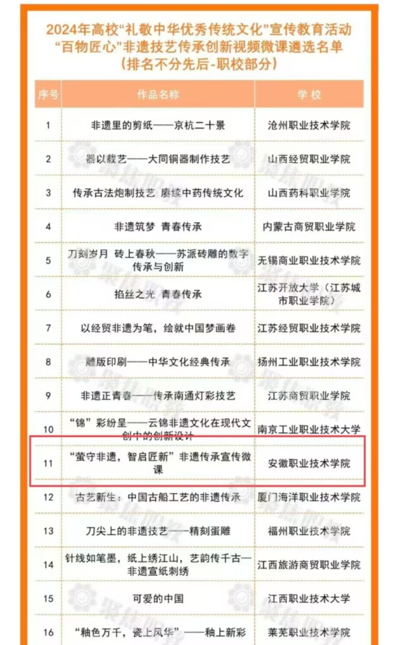 本网讯(智能制造学院)近日,教育部发布《关于 2024 年高校“礼敬中华优秀传统文化”宣传教育活动结果的公示》,我院送选的微课《萤守非遗,智启匠心》成功入选,这也是安徽唯一一所选入“礼敬中华优秀传统文化”宣传教育活动“百物匠心”非遗技艺传承创新视频微课项目的高职院校。