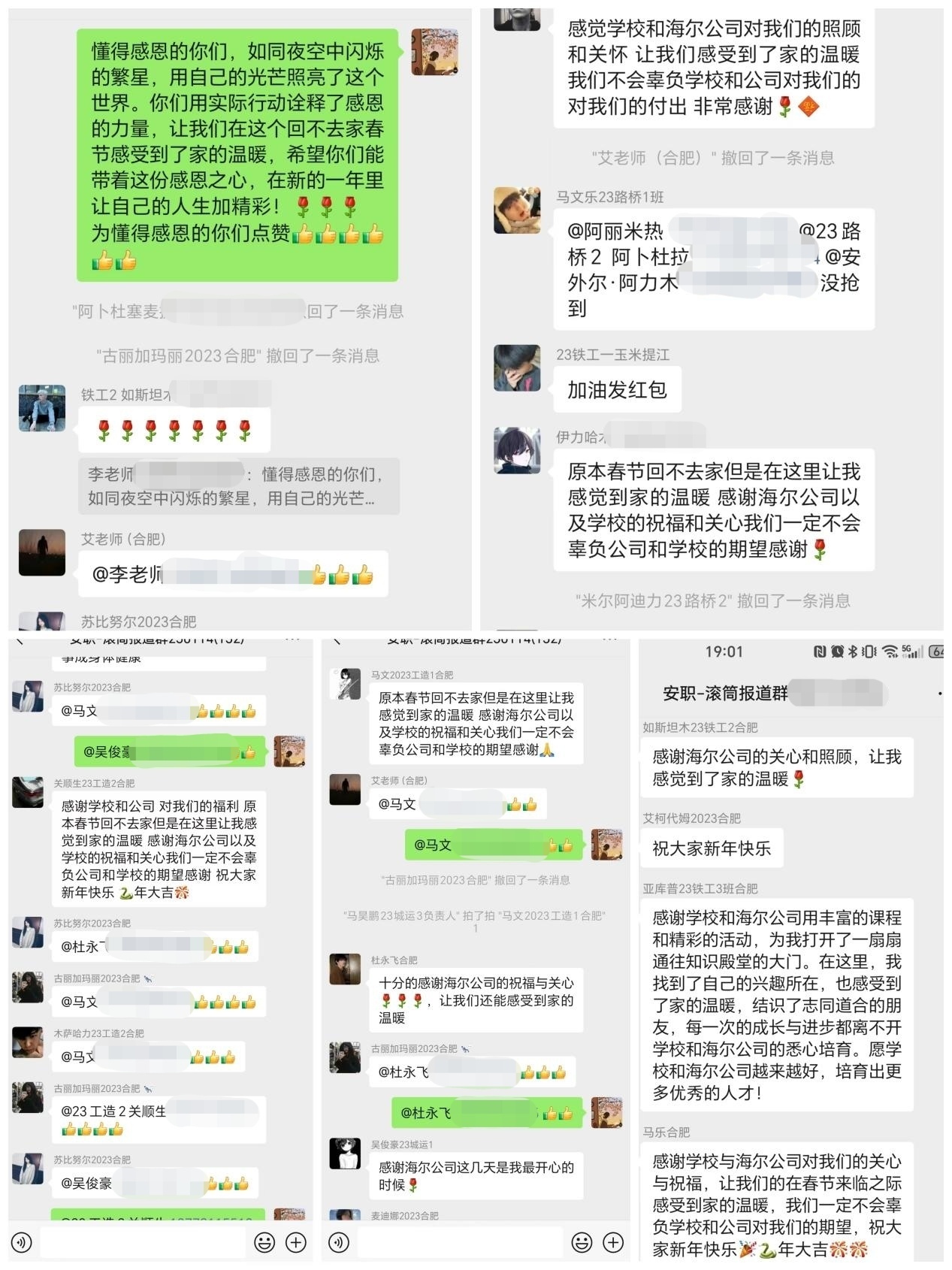 在一系列精彩纷呈的春节活动圆满落下帷幕后,同学们内心的感激之情如潮水般涌动,自发且热烈地表达出对各方关怀的深深谢意。这些正值青春的民族中职生们,虽远离家乡千万里,但在学院以及海尔公司的全方位关怀下,这个春节充满了家的温暖与温情,令他们刻骨铭心。大家纷纷表示,学院的老师们不辞辛劳,从学习上的耐心指导到生活中的贴心照料,每一个细节都饱含着浓浓的师爱;省教育工委的关怀与指导如明亮的灯塔,为他们的求知道路指引方向;海尔公司的爱心服务,更是为他们的学习生活增添了诸多欢乐与惊喜。未来一定会珍惜这难得的学习机遇,不断提升个人能力与素养,积极投身社会建设,将这份温暖与关爱传递下去,为家乡的繁荣发展添砖加瓦,以实际行动回馈所有给予自己帮助的人。