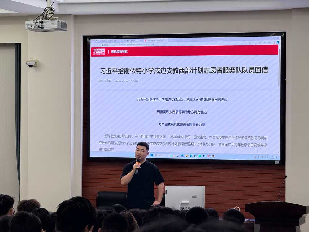 5月8日的团课重点聚焦学习习近平总书记给新疆谢依特小学戍边支教西部计划志愿者服务队队员的回信。杨哲结合自身支教经历,讲述了在共青团的引领下成长进步的所思所悟。他鼓励同学们要坚定理想信念,将个人的成长与国家的发展紧密结合起来,把个人的“小我”融入国家的“大我”之中;要厚植家国情怀,将爱国之情转化为实实在在的报国之行,以实际行动践行对祖国的热爱;要努力练就过硬本领,不断提升自身素质,做有理想、有才干的实干家,为国家的发展贡献自己的智慧和力量;要发扬奋斗精神,勇于到祖国和人民最需要的地方建功立业,以青春之我、奋斗之我,为中国式现代化建设添砖加瓦。讲述真挚而富有感染力,同学们深受鼓舞,现场不时响起热烈的掌声。