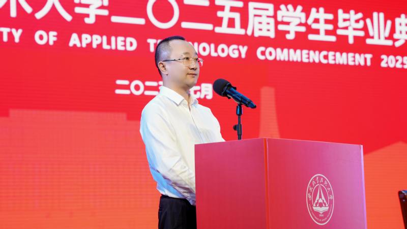 教师代表、智能制造学院李彦以其独特的“学生—教师”双重视角,勾勒学校从“轻工业学校”到“职业技术大学”的蜕变轨迹。他勉励学子“争当终身学习者、工匠精神传承者、时代重任担当者”,嘱托毕业生以校训为人生航舵,“如校徽齿轮般啮合产业脉搏,似翠竹般节节攀升向阳生长”。