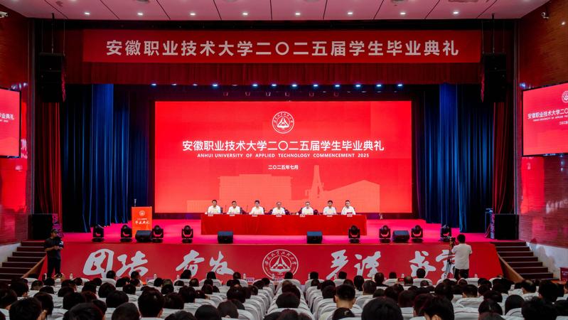 本网讯(学生处)7月1日上午,安徽职业技术大学2025届学生毕业典礼在至立会堂隆重举行。校领导、职能部门与二级学院党政负责人、毕业班辅导员、特邀教职工代表、毕业生及生源校校长代表齐聚一堂,共同见证学校升格为职业本科大学后首届毕业生的荣耀时刻。典礼由宣岩松主持。