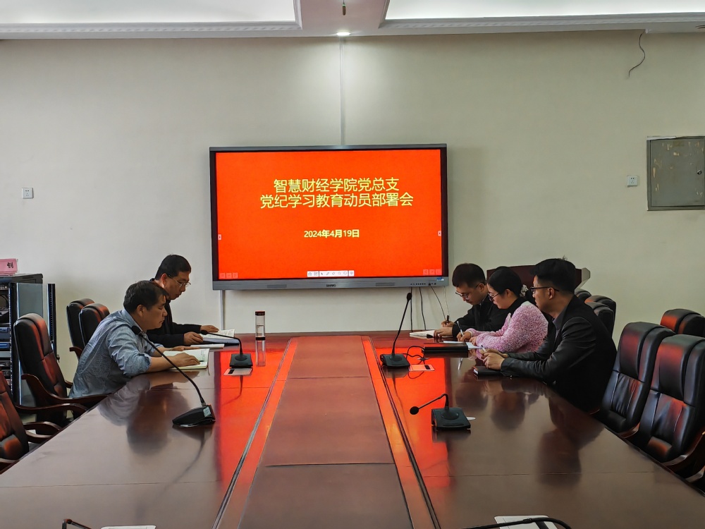 4月19日,智慧财经学院党总支召开党纪学习教育动员部署会议,研究部署党纪学习教育工作,学院党总支负责人汪洪斌主持会议,学院党政班子成员参加会议。