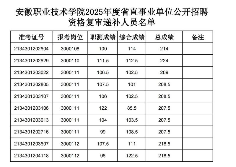 根据《188bet足球比赛结果分析2025年度省直事业单位公开招聘工作人员专业测试及有关工作实施方案》,岗位编号3000108、3000110、3000111和3000112因考生资格复审未通过或放弃资格复审等原因,导致出现人选缺额。现依据笔试成绩,从高分到低分依次等额递补(笔试成绩须达到最低控制合格分数线,且每科成绩均不低于60分)。若最后一名出现多名考生笔试成绩相同情况,则一并进入资格复审环节。