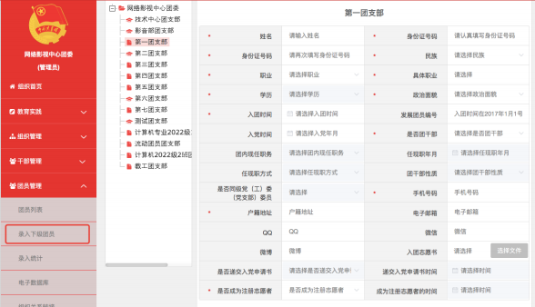 团委/团工委/团总支管理员登录“智慧团建”系统,进入管理中心,点击“团员管理——录入下级团员”菜单进入录入界面。在界面左侧组织树中选择录入人员所在支部,根据界面提示录入