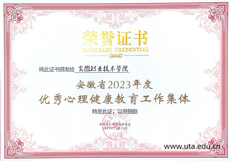 (学生处通讯员 萧潇)11月18日—19日,安徽省心理咨询师协会第三次会员代表大会暨2023年学术年会在芜湖召开。经过大会评选,学院荣获“安徽省2023年度优秀心理健康教育工作集体”荣誉称号。